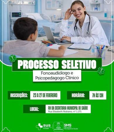 Processos seletivos oferecem vagas para Fonoaudiólogo e Psicopedagogo Clínico, com inscrições abertas de 23 a 27 de fevereiro