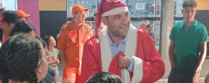 Vestido de Papai Noel, prefeito de Nova Andradina prestigia festa da ACINA